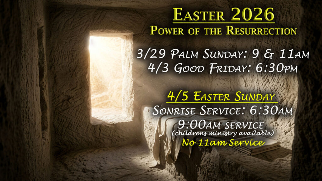 Sun, Apr 5th. Sonrise service will be @ 6:30am in the courtyard, family style service. There will be a free continental breakfast after. We will have only the 9:00am service after that, children’s ministry will be open and they will be having an Easter egg hunt.